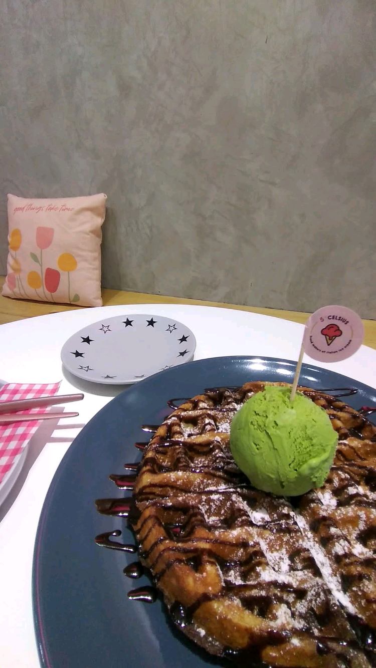 The waffle with matcha ice cream—crispy, light, and packed with earthy matcha also not bad.