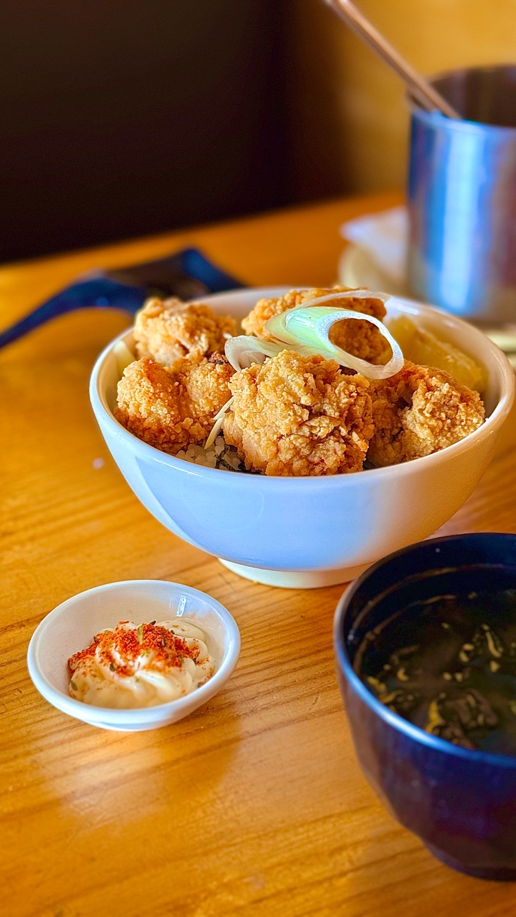We ordered the Wakatori Karaage Don (fried chicken with rice, miso soup, and cabbage with sesame sauce) and a small Chirashi Don, which also came with miso soup.