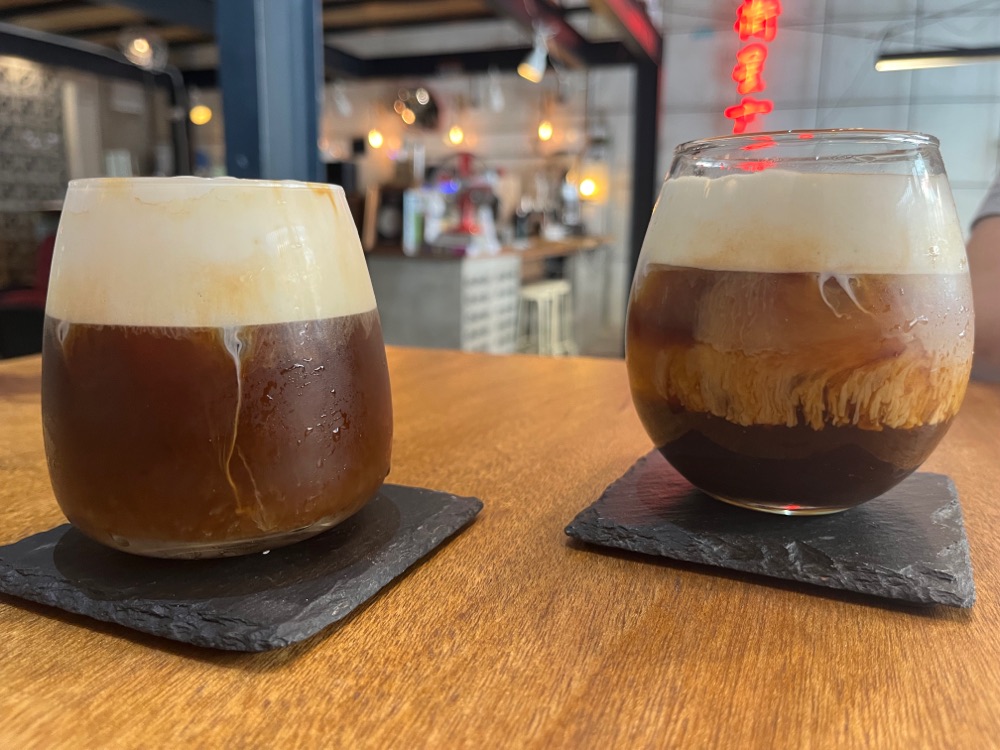 There’s two cup of Irish Coffee, the left one is without syrup and cocoa powder, right one is normal irish coffee at Ampersand.
