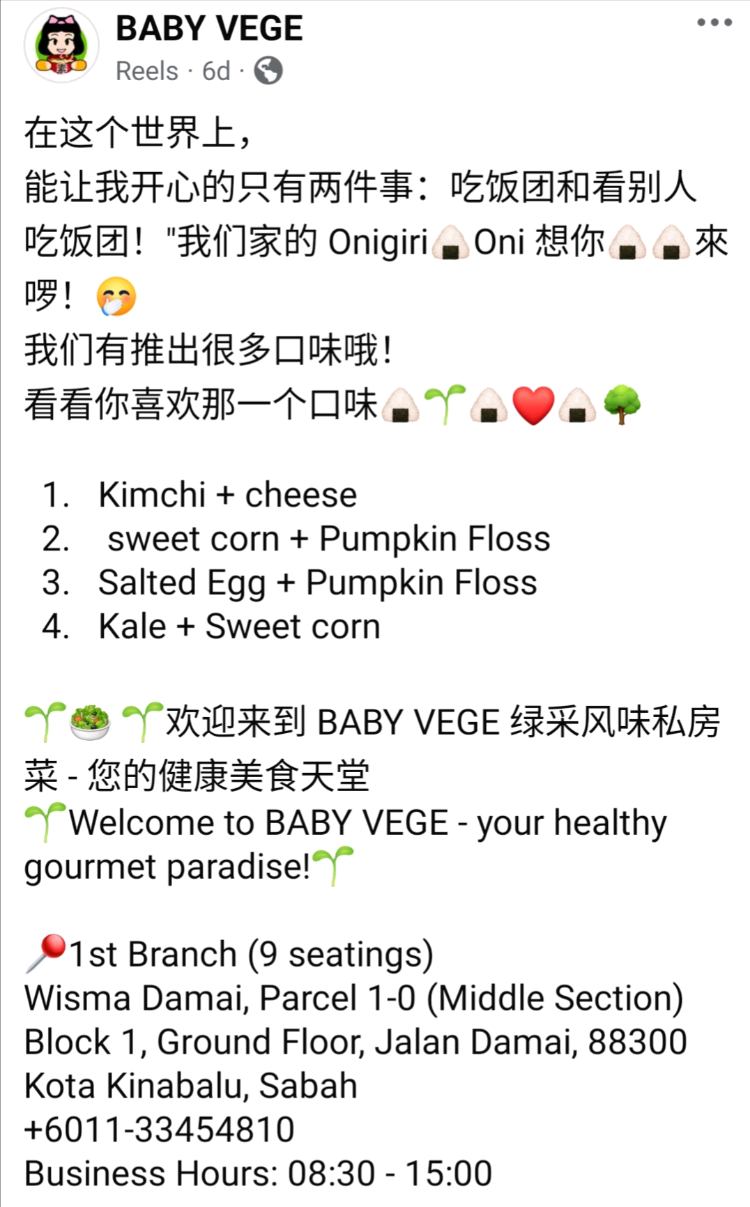 Baby Vege – Heritage Plaza is location at Ground Floor, Lot 22 Block C, Heritage Plaza, Jln Lintas, Luyang, 88300 Kota Kinabalu, Sabah.