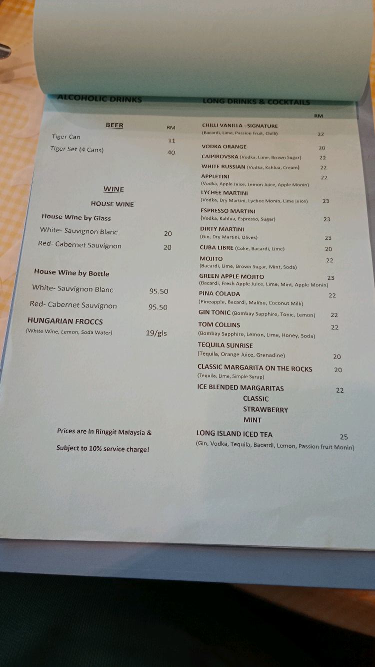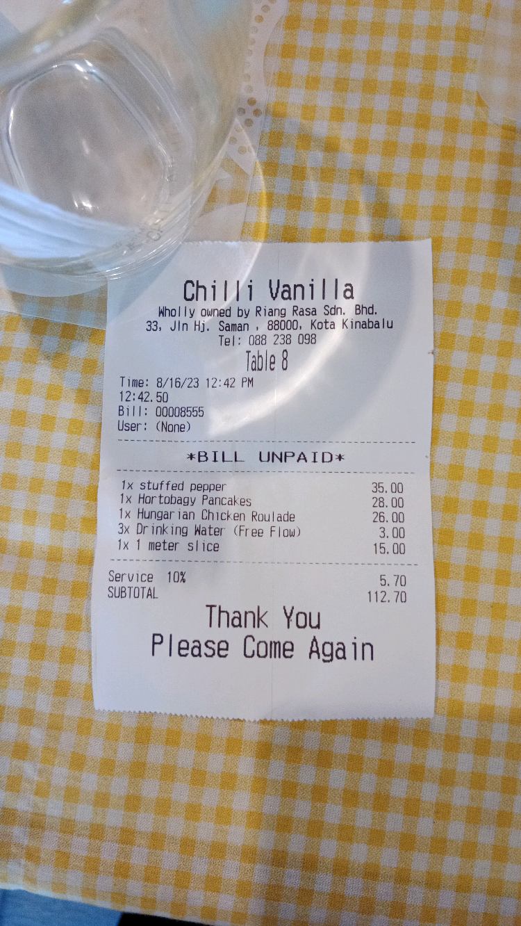 Hortobagy Pancakes (Pic 1&2) RM28: The crepe is so so so nice😍😍😍Nice until i hope they have dessert with the crepe too. The minced beef filling with paprika gravy fit each other well. Beautiful presentation. Sauce is not too heavy taste. Hungarian stuffed pepper with parsley potato, RM35. Delicious! Heavy sauce, firm, juicy , 饱满rich, beef meatball. There are rice inside the meatball too. Big portion. Chicken Roulade RM 26 : Good , good. Not oily Mashed potato: heavy butter Hungarian 1 meter slice: RM 15. Sponge cake + Custard+ Vanilla + chocolate. Can taste 2 flavours of cake + custard+ chocolate syrup one go. Interesting, can try try for fun. 没有到很好吃,但可以尝鲜 VIP: Pancakes!! 10% service charge Will figure out why it is called Chilli Vanilla next time Mari, mari