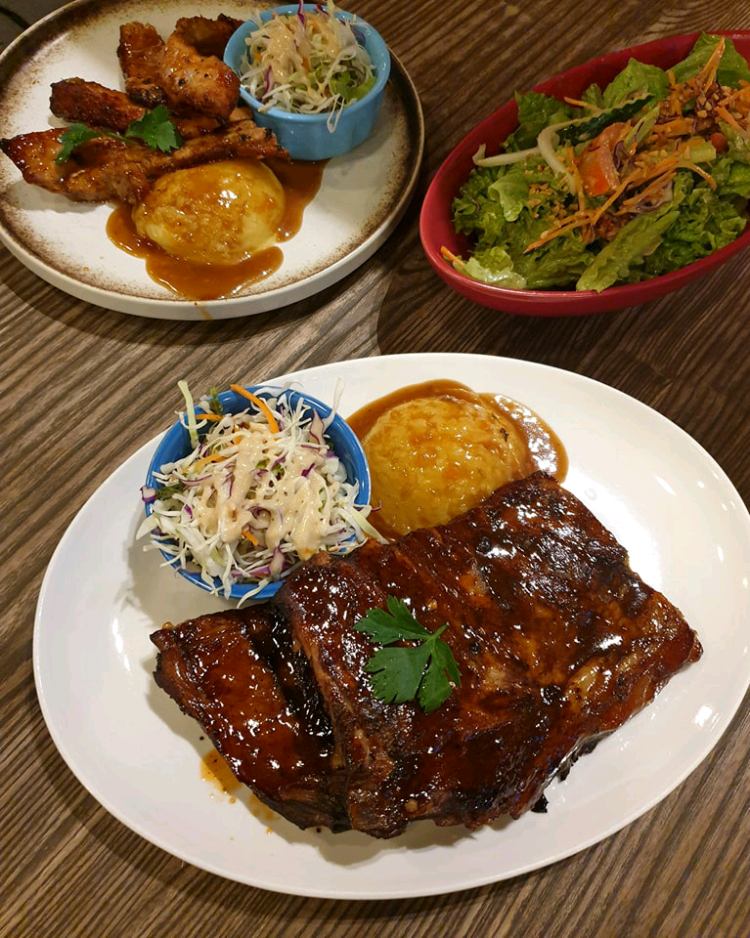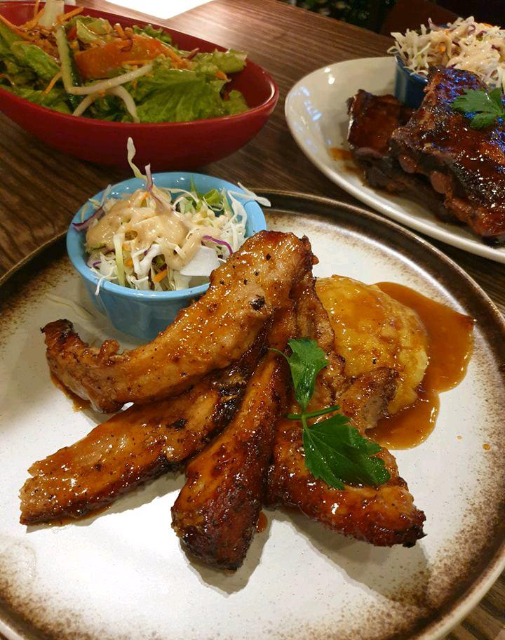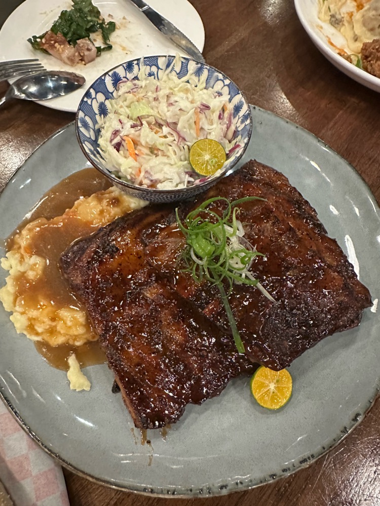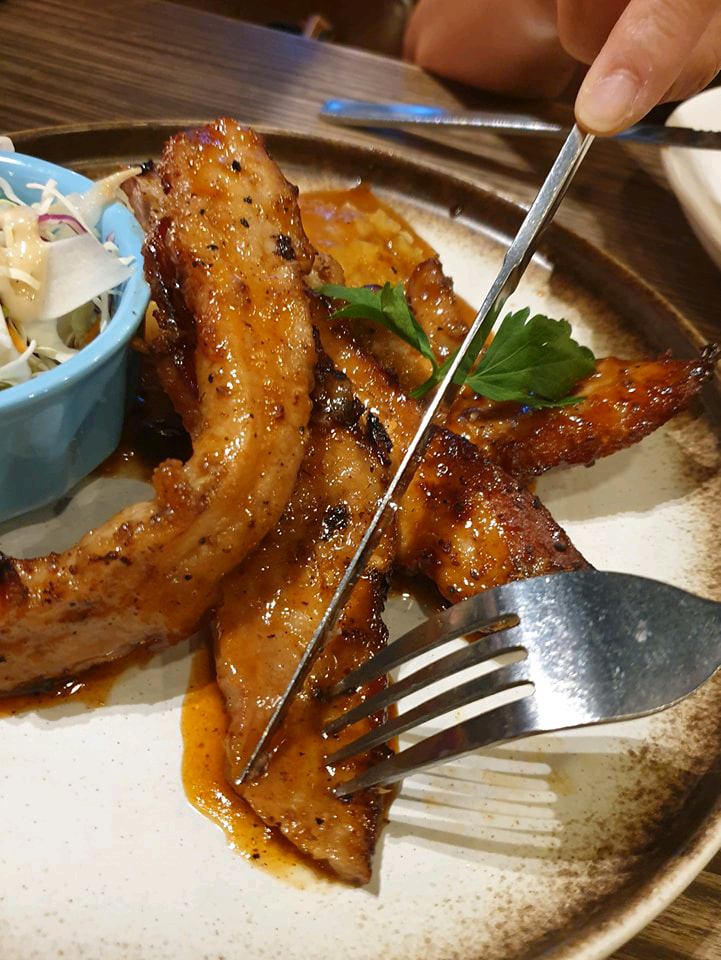 版主来这的目的很明确就是要吃 猪 ! 餐厅没有提供实体菜单,要吃什么就数码扫描下单就对。经服务员的介绍后就点了招牌 Pork Belly 和 Sticky Pork Ribs,那也就是猪的腩和肋排部位。 两者味道和口感各不相同,但都一样非常的好吃,而版主最爱就腩部位,一口咬下去那油滋滋的香气回绕在口中真是美味极了。而猪肋排就口感比较软嫩,其调配的酱汁让人越吃越开胃,美中不足的就是骨多肉少,而且还是大大支那种,吃得版主到喉不到胃不够过瘾。 一份 Pork Belly RM35.27,一份 Sticky Pork Ribs RM58,一份 Chubs' House Salad RM17.09,白水一杯 RM0.73 x 2杯,再加服务费和SST全部买单一共 RM129.70。在高级的餐厅用餐,整体算起来不会贵,而且还在亚庇的市中心,重点食物真的很鬼死正,版主强力推荐。 The Chubs Grill 就位于 Plaza Shell 底楼,宽阔的内部共分上下两层,餐厅采用的是暗沉的色调,设计元素围绕于木料和红酒的装潢,欧式古典的气氛相当浓厚,在这用餐非常的有情调,拍拖一流。 导航图: https://maps.app.goo.gl/vCsyEyPL3wMTn43eA