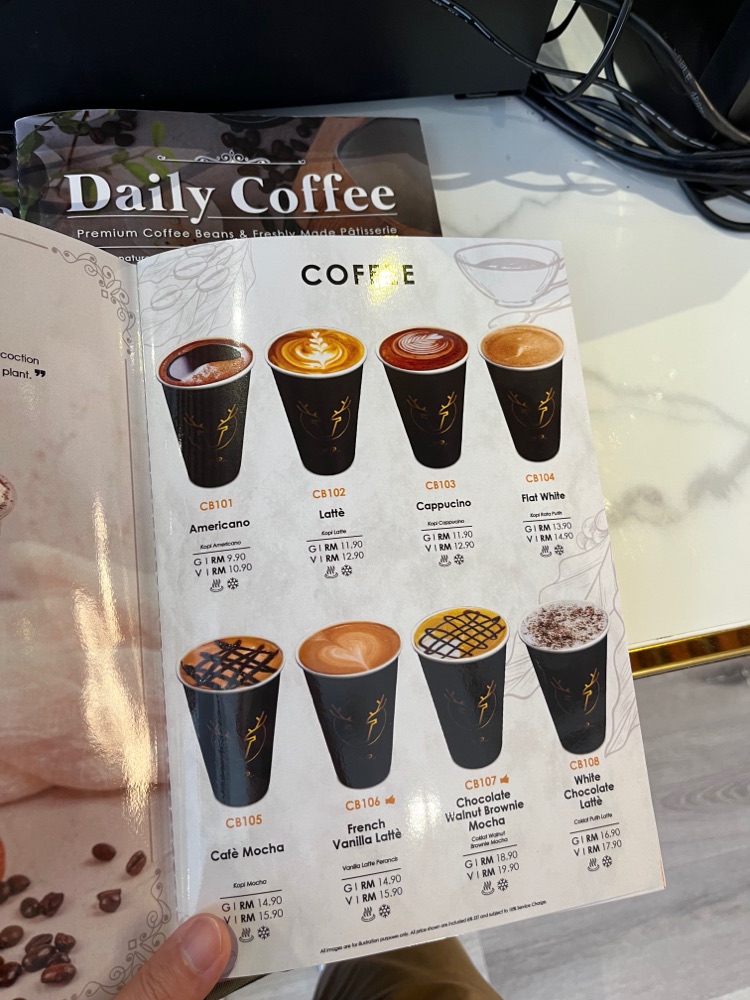 Had their iced Latte, it was two shot coffee. Bitter taste coffee, just like Starbuck taste. Grande size. Info from their barista, Daily Coffee’s Americano and Flat White, grande(normal) size is 3 shots and venti(large) size is 4 shots. So if u wan more shots coffee can try Daily Coffee. Latte and cappuccino are 2 shots.