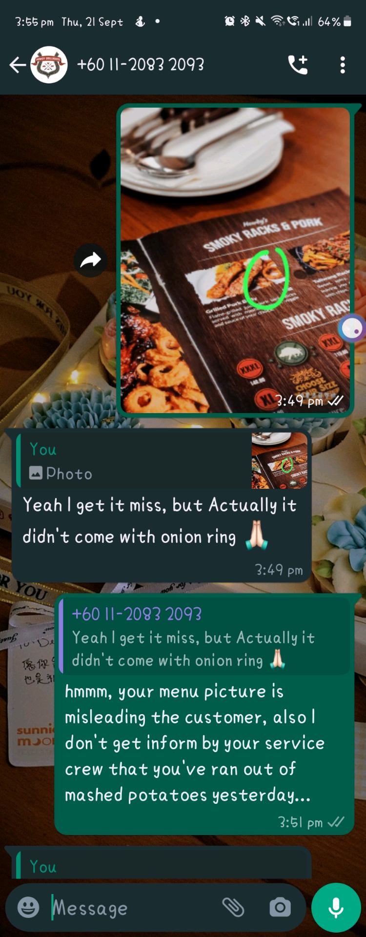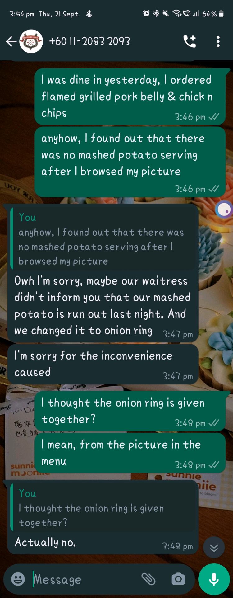 After our visit to Doulos Hope, we headed over to Howdy Grillhouse, which situated on the ground floor behind Jesselton Quay. This grillhouse has its roots in Kuching, Sarawak, & has expanded with 2 branches at Pontianak & Jakarta, Indonesia. Upon our arrival, the restaurant was almost full, nevertheless, the polite waitress managed to get us a table. The interior boasts meticulously & modern wooden design elements, creating a cozy ambiance with Texas style. Here's what we've ordered: Chick N Chips Flame grilled 2 boneless chicken leg marinated with traditional 'kampung' spices, served with coleslaw, chips & Taliwang sauce Grilled Pork Belly Flame-grilled juicy pork belly slices served with mashed potato, veggie & St. Louis sauce. Honestly speaking, both of us were drawn to the unique flavours of the sauce accompanied by rather than the main dishes themselves. St Louis has robust smoky notes with a pronounced sourness, while Taliwang sauce starts with a sweet flavour then sambal-spicy like combination of flavours. The veggies was salty but alright, however the onions rings color is vibrant orange colours battered hence it looks like chips & truly appetizing. I realized the next day my main meal was not served with the mashed potatoes. Mr Boyfriend was unsatisfied with the size & texture of their fries as well. The thin cut fries were overcooked, hence the texture was undesirable because achieving the perfect balance of cripiness & softness can be tricky. I texted them about the mashed potato & misleading picture in their menu, their replies was the waitress failed to inform me when I placed my order initially. So, guys, do y'all prefer your dishes served match the pictures in menu precisely, or just okay with whatever they serve alhough it's different but with the price value? Kthxbye.