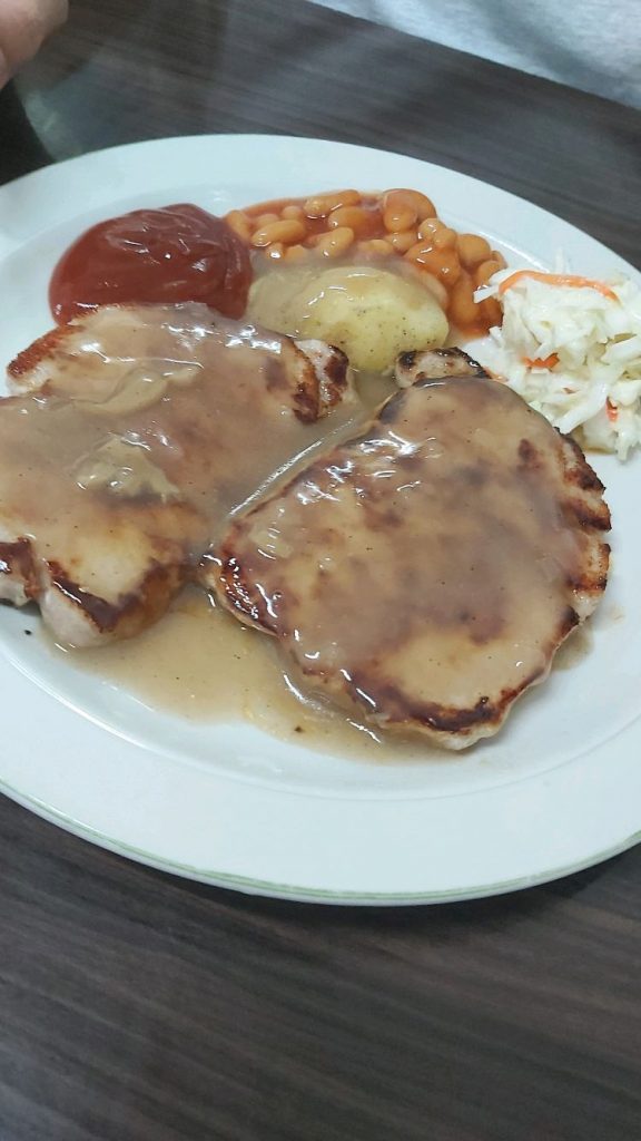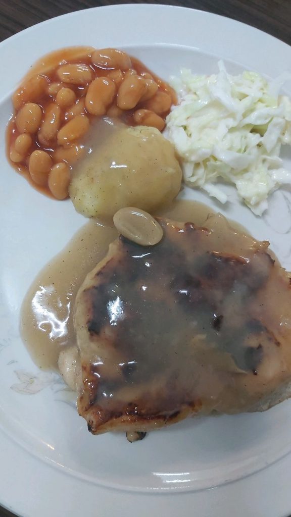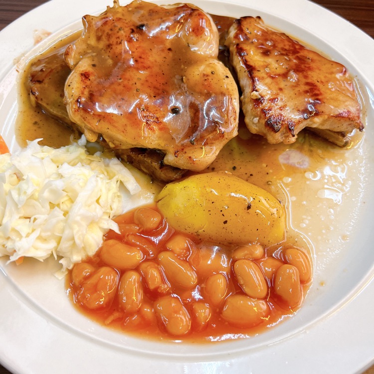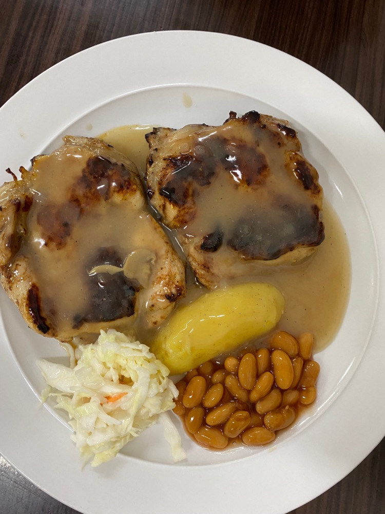 It comes with side dish of steamed half potato, baked beans and coleslaw, they all are alright for me, nothing too Wow about.