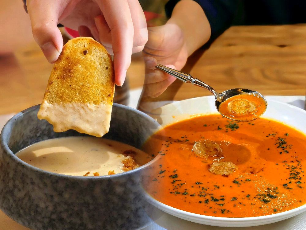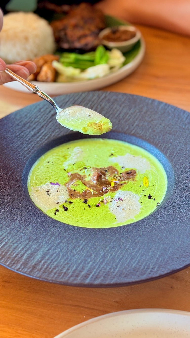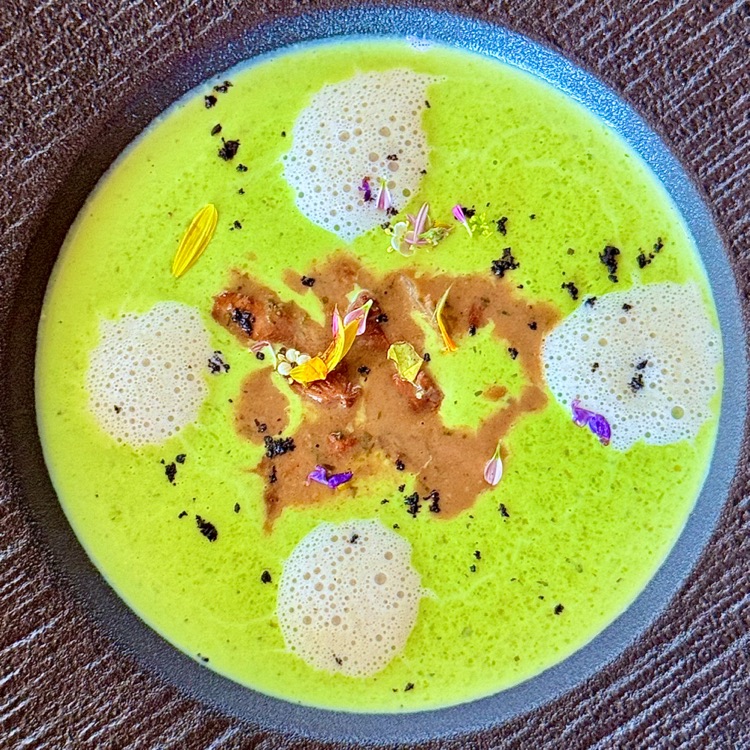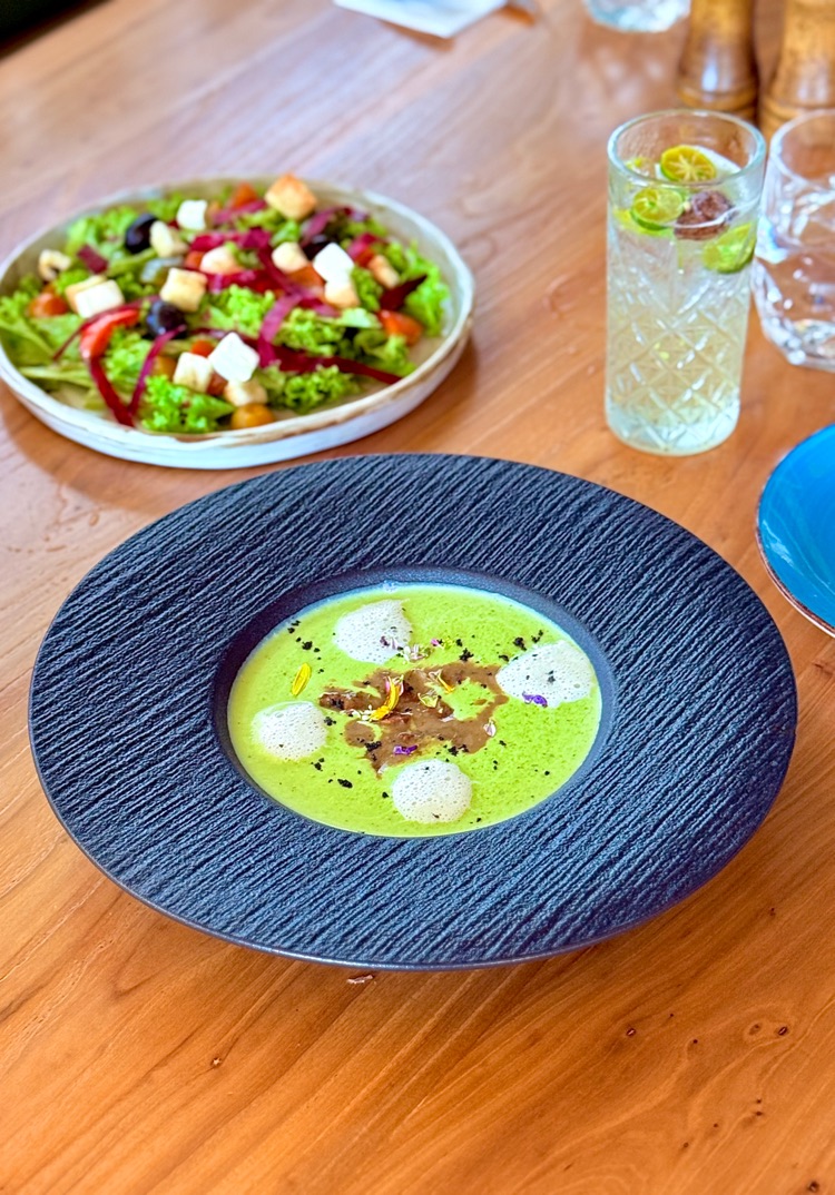🫛Green peas soup (mint pepper flavoured thick cream peas soup with chicken broth, diced chicken thigh, and carrot foams)