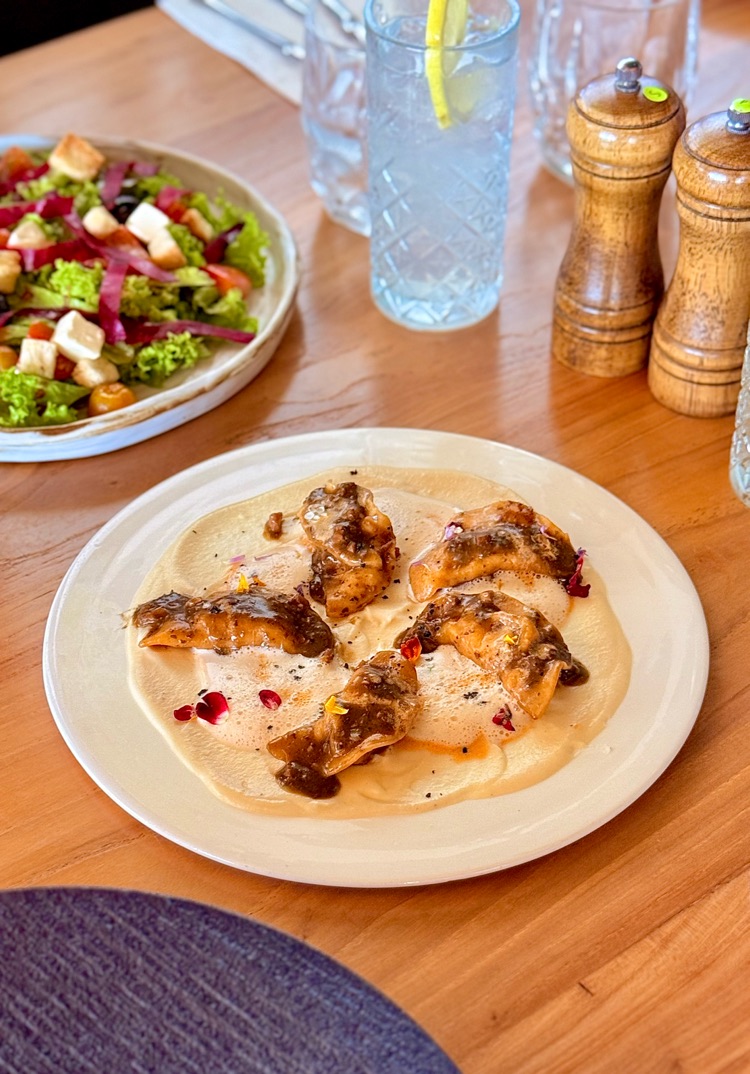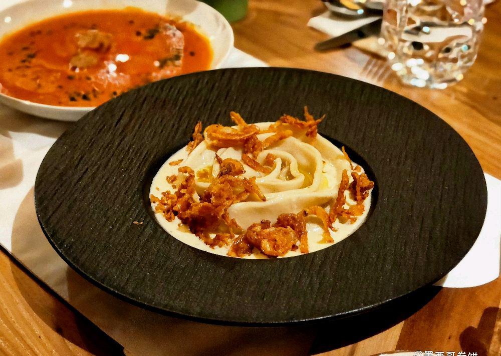 🦐Scallop and prawn ravioli (housemade ravioli filled with Hokkaido scallops and prawns served with cauliflower mousseline and crustace foam)