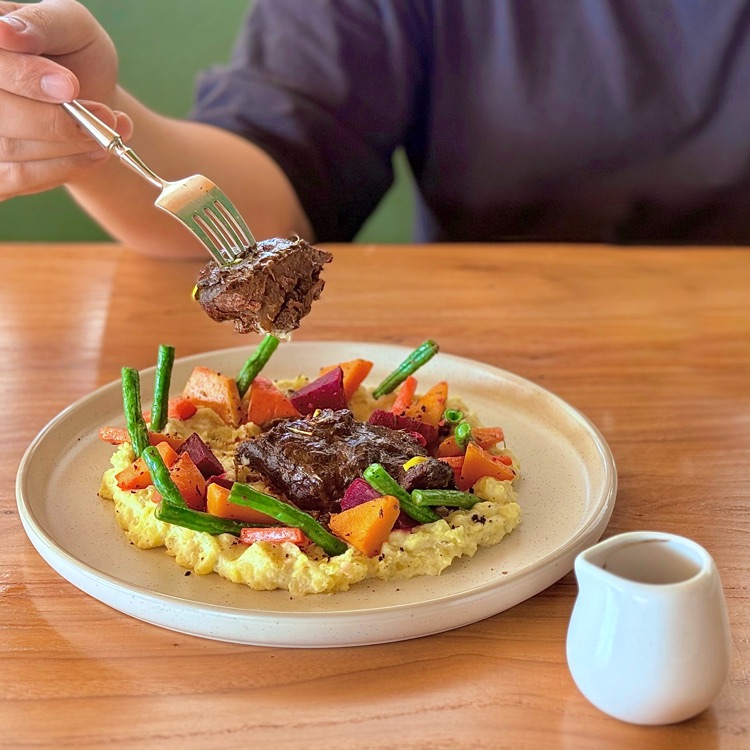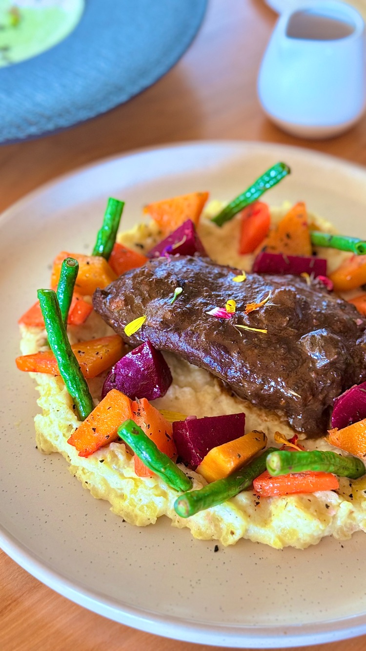 🥩 Chef’s signature of 8 hours braised beef’s cheek drizzled with truffle oil with smoked scallops on truffle mashed potatoes and veggies, finished with an aromatic crustacean foam