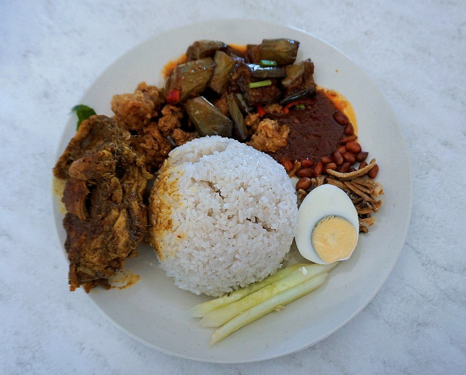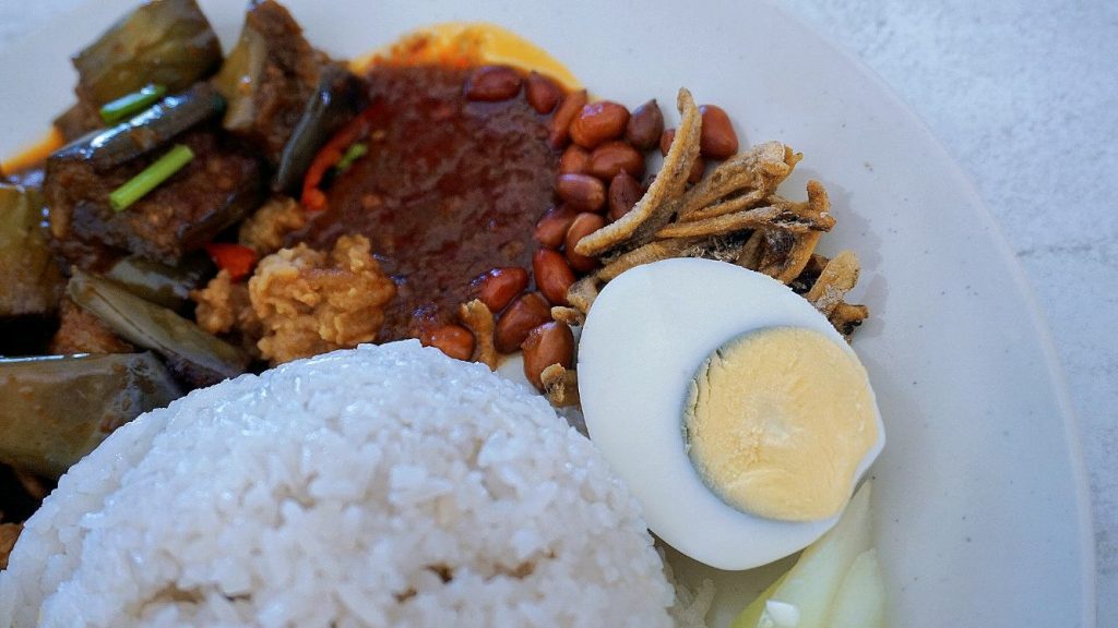 Nasi Lemak is MYR4, consists of steamed white rice with coconut milk, spicy sambal, peanuts, anchovies & sliced cucumber.