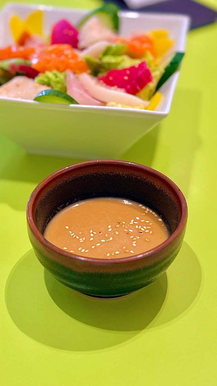 That dressing is Japanese-style vinaigrette with a touch of minced onion, sesame, vegetable oil, and soy—isn’t overpowering, but it hits your taste buds in the best possible way. My mouth’s watering just thinking about it.