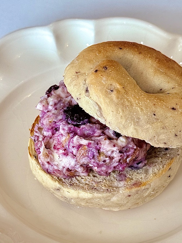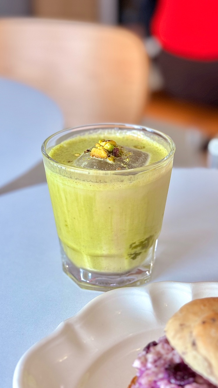 His signature offering is the blueberry cream cheese bagel, which I paired with one of his specials, a pistachio cafe latte—making it a creamy and nutty combination.