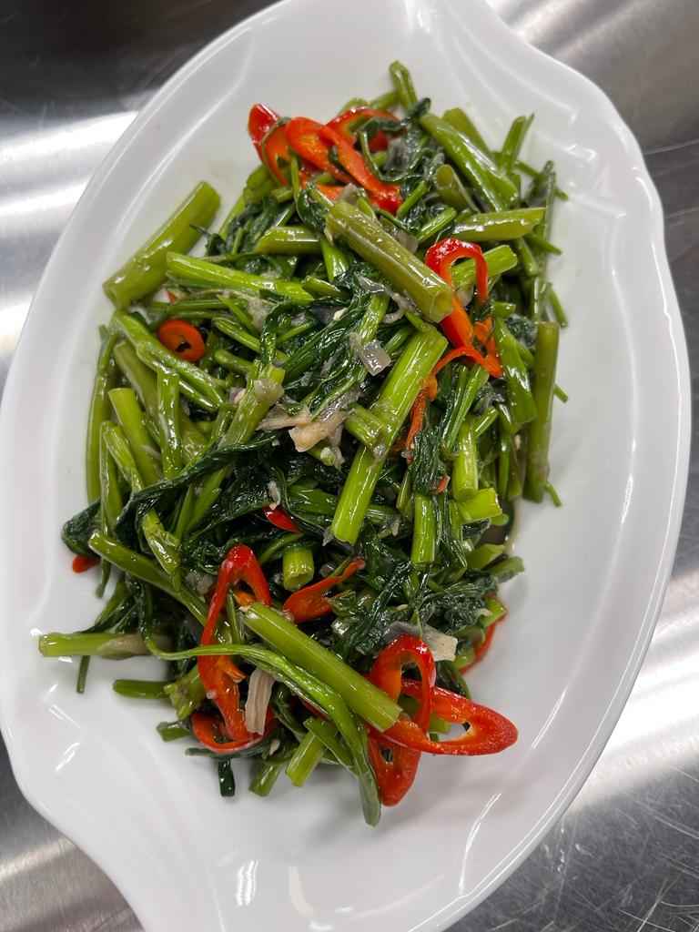 Balado chicken thigh served with spicy red chilli, boiled veggie & steamed white rice.