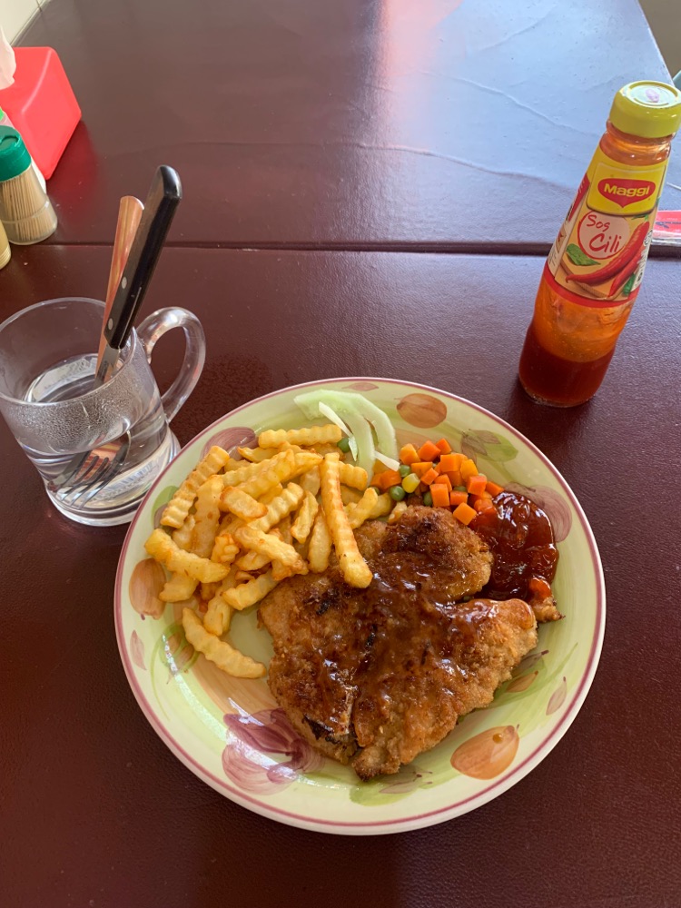 The chicken chop here very unique. At 1st i thought it was fried then grilled a bit, then the boss informed it is grill chicken with breadcrumb on. Btw, u can also request for grilled chicken without breadcrumbs on anyday.