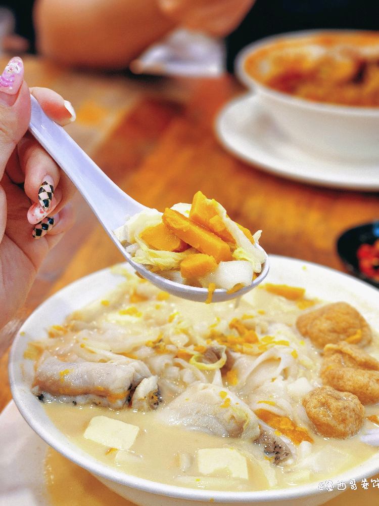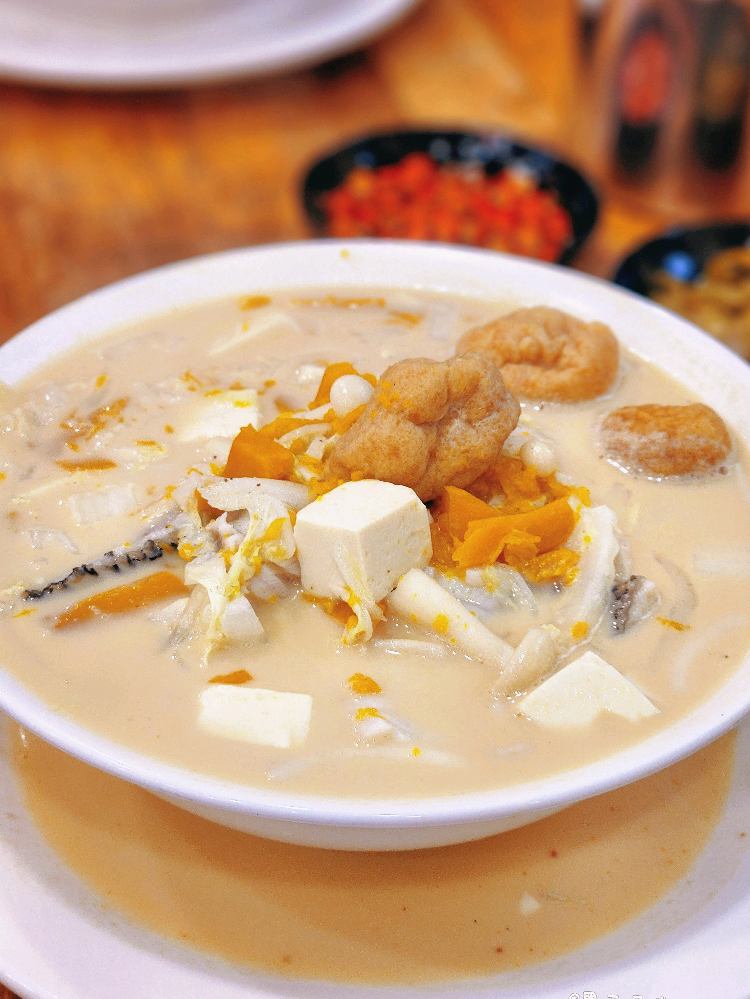 pumpkin creamy soup with fresh fish & flat rice noodle.