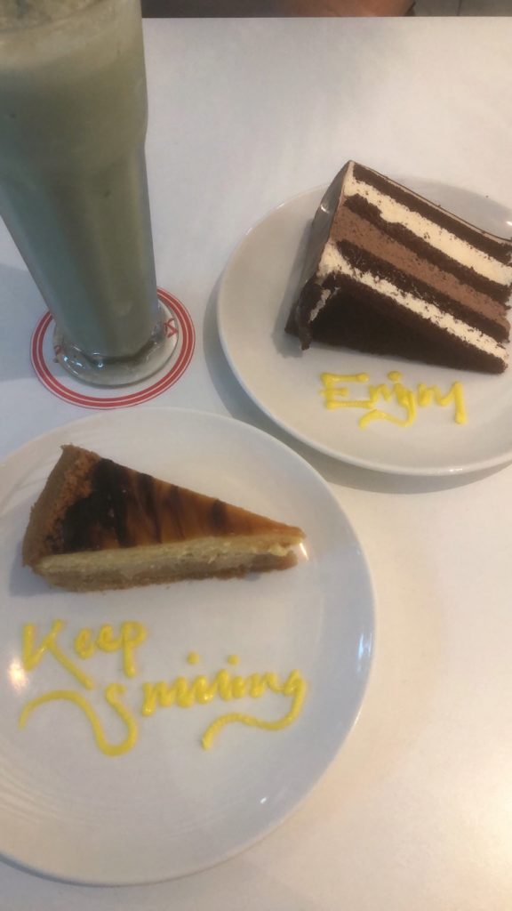 自从MCO 实行,好久没去吃了。好怀念他的食物!趁没什么人潮,就决定内用😍🥰 Crispy chicken salad - 鸡肉粒炸的酥脆,味道还是一样很好吃!蔬菜类蛮新鲜的,只是有半粒的小番茄是黑的(那时的我立刻脑海里回想另一半坏的圣女小番茄难道不小心吃了吗?但是没有吃到怪怪的味道🤔😅) 也就算了。通常我会要求酱和沙拉分开,因为他们的酱会有点辣。如果全部倒去沙拉里搅拌,对我来说太辣了。总体来说还是很好吃! Salted caramel macadamia cheesecake - 第一次尝试。真心觉得也太好吃了吧!咸甜咸甜的,口感也有不同的层次。软绵绵的蛋糕里有些脆口的夏威夷果,赞啦👍🏻 只是觉得芝士没有以前那么浓郁那么厚了。 Chocolate indulgence cake - 还是一如往常那么好吃。没什么好说的,经典中的经典。但是因为这款会有点偏甜,可能吃到最后会有些许的腻口。 Ice blended green tea - 超级好喝!也是和以前一样!我都是要求不要whipped cream 因为本人不喜欢😁 其实本来是要叫那个西芹苹果果汁,才发觉到已经不在菜单上了。有点失望呢…… 食物的品质还是很好。环境更不用说,是舒服的也更宽敞。服务也是不错👍🏻