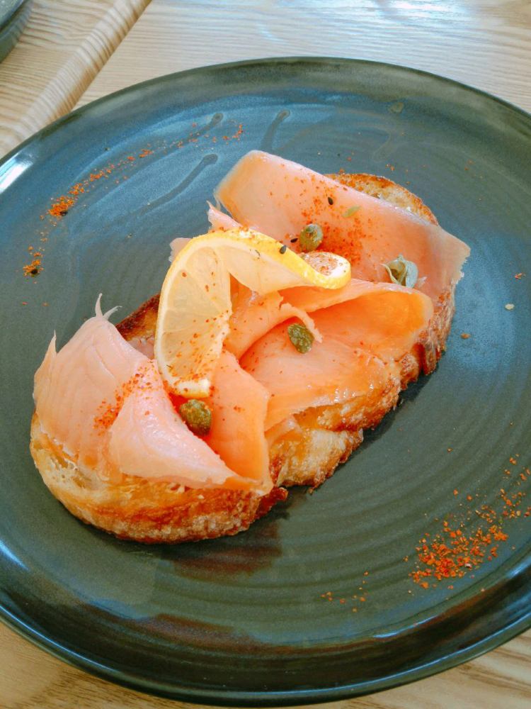 Nice combination of smoked salmon, ricotta, capers, poached egg, ebiko, bonito flakes, siracha Aioli.