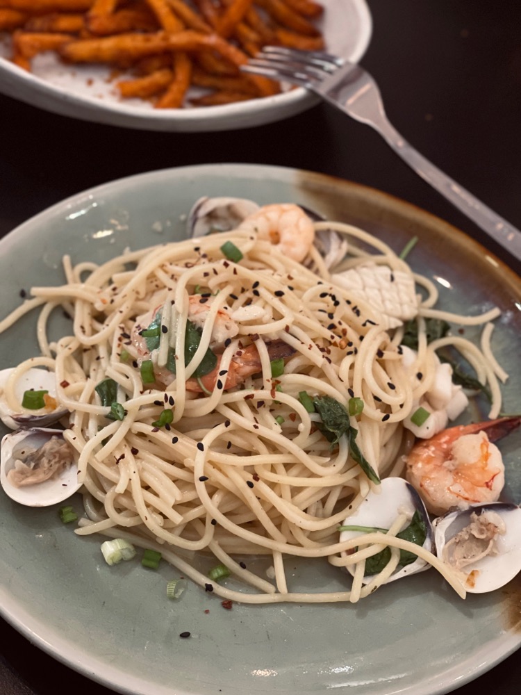 🍝 Soft shell crab pasta - 6/10would be nicer if the sauce was a little creamier 🐔 Pan smeared chicken breast w risotto-6/10 🍝 Seafood aglio olio pasta - 6/10 average in taste 🍚 Kimchi rice w soft shell crab - 8/10 🍠 Sweet potato fries - 10/10 great snack loved it!