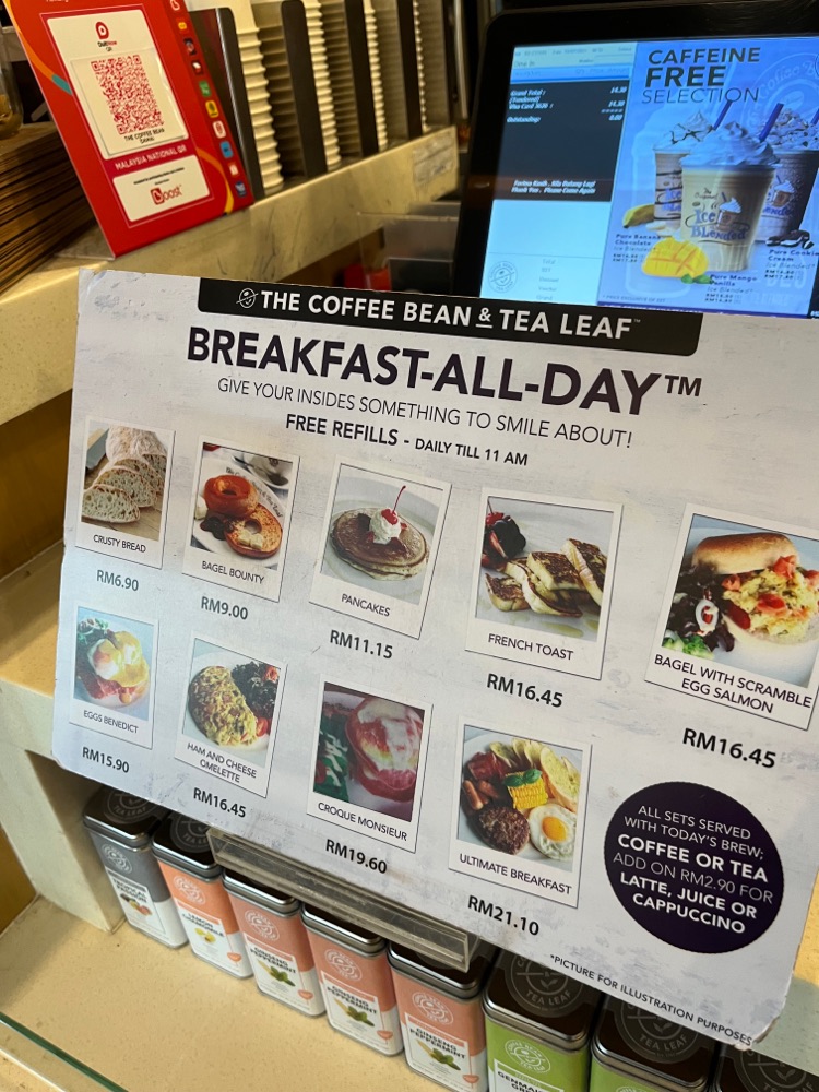 Coffee Bean & Tea Leaf had their breakfast menu everymorning until 11am. Really super affordable, had their egg benedit with super large cup of latte only cost Rm14.30. Bitter latte 👍🏻