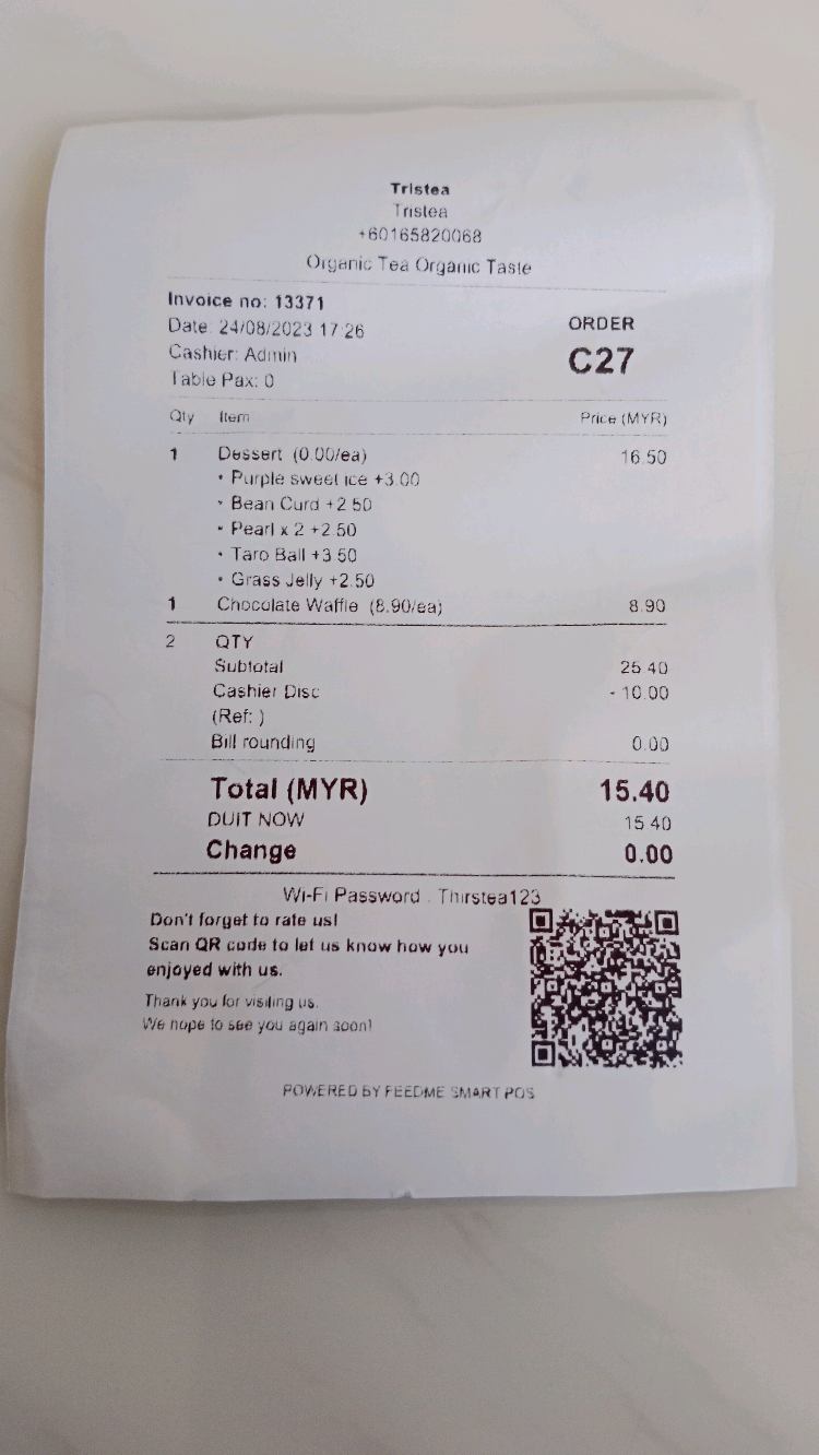 Free membership 3 vouchers Buy 1 free 1 (Drink only, pay the higher price one) x1 Spend RM 25 get RM 10 off x3 Spend RM 10 get RM 3 off x10 QQ Pearl very very nice, large bowl! Syok! 😋 Grass Jelly good good Not too sweet Waffle thick & fluffy, oklah