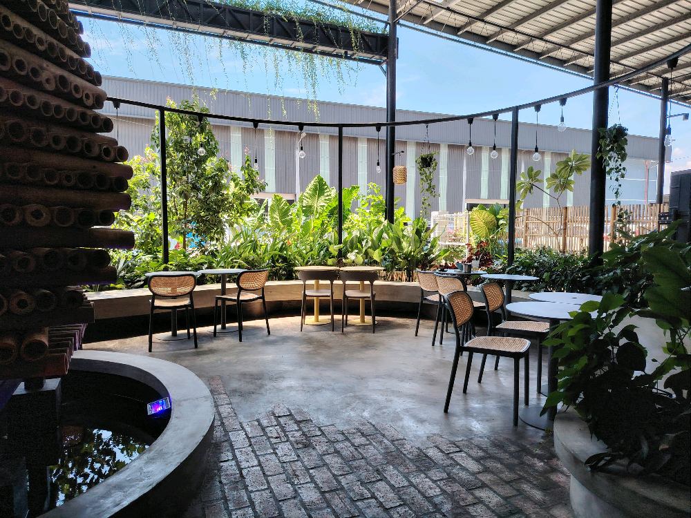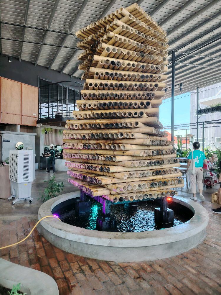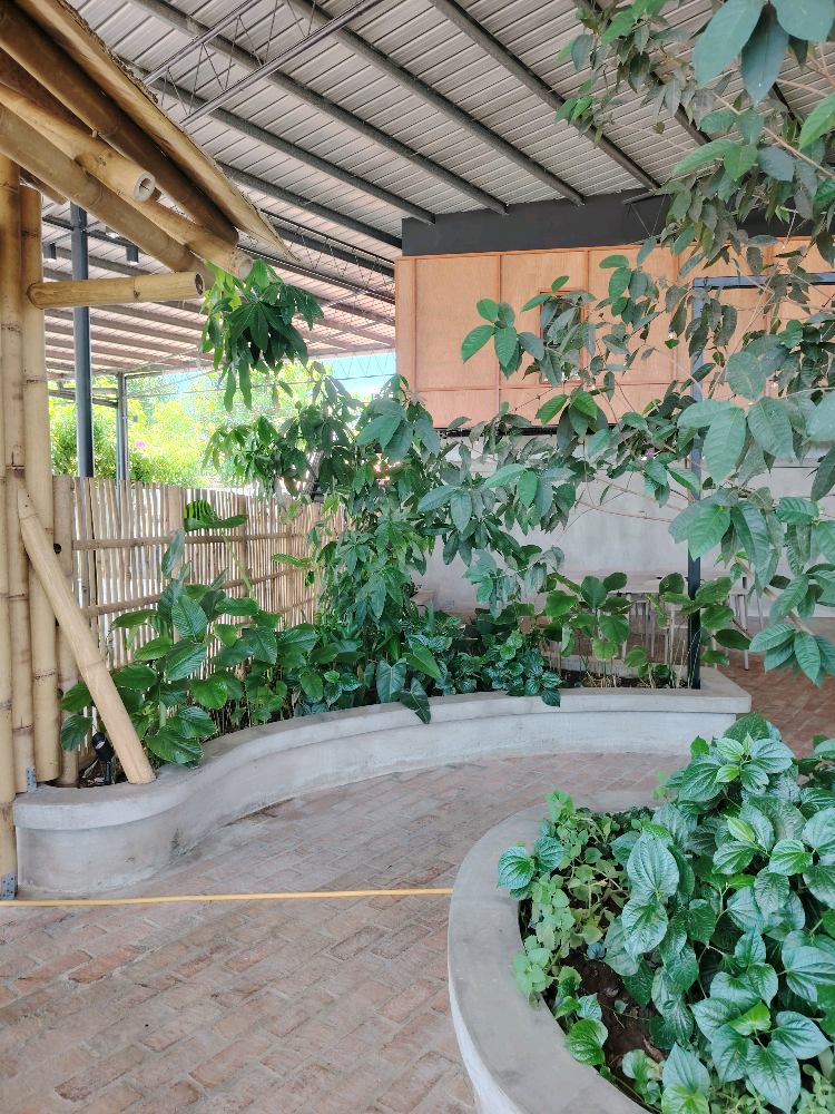 The greens, water feature and high ceiling helps to keep the place cooling. Excellent use of space with different sitting options.