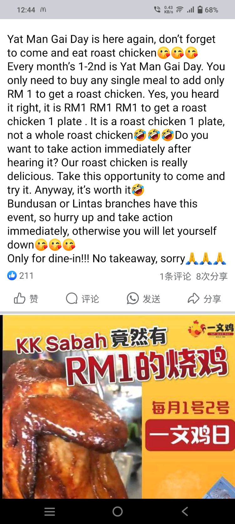 Yat Man Gai is cantonese language, which means RM1 Chicken